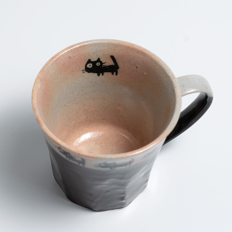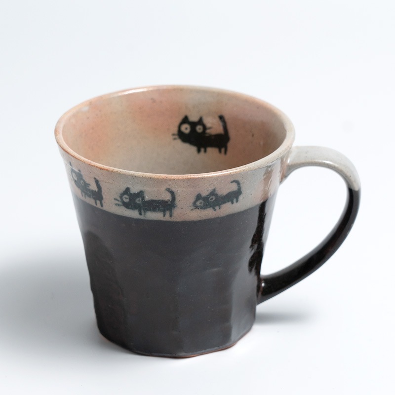 4匹の可愛い黒猫がお散歩しているマグカップです。