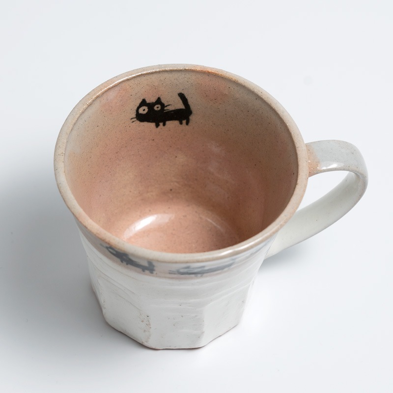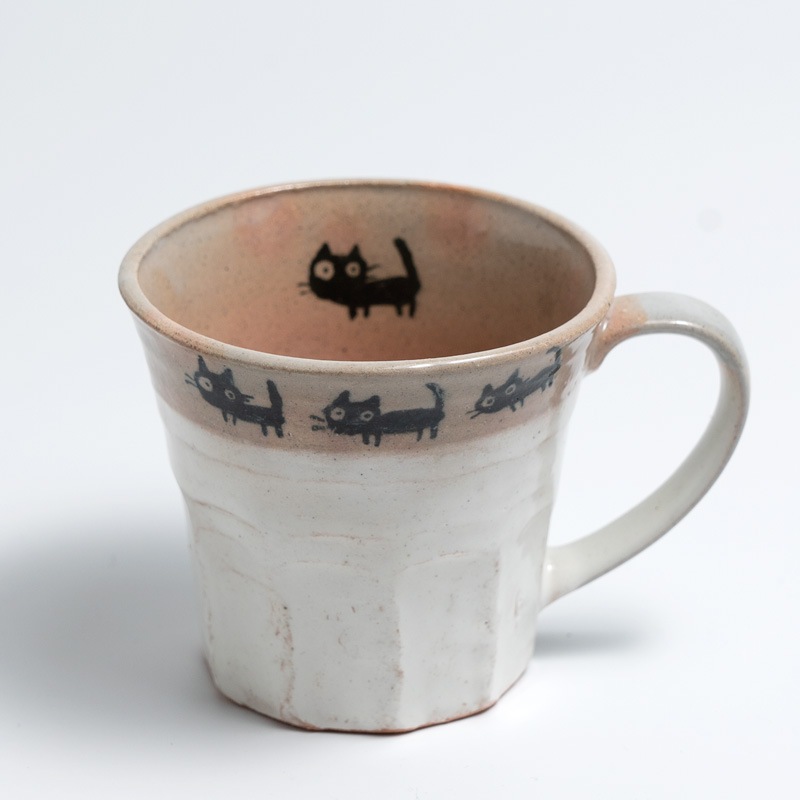 4匹の可愛い黒猫がお散歩しているマグカップです。